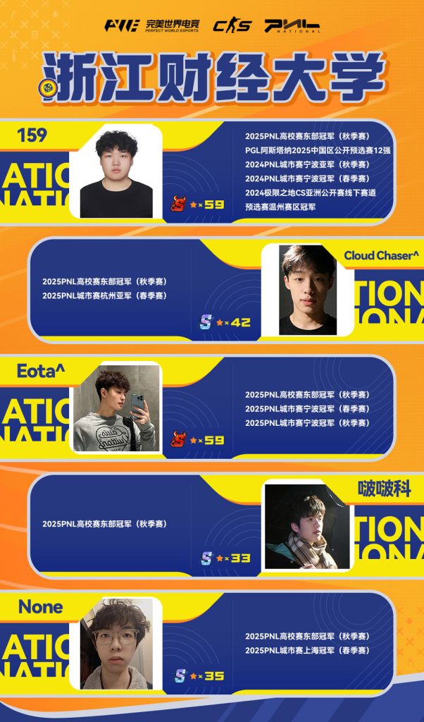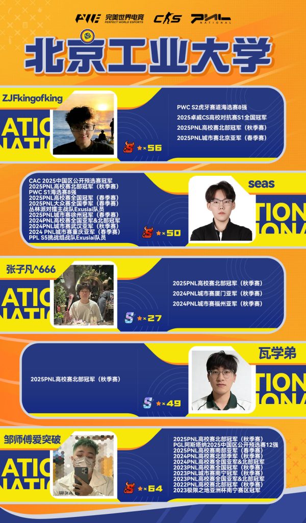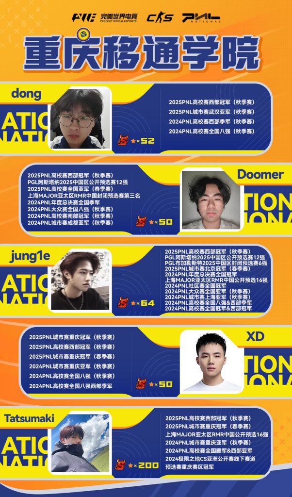 重慶移通學院聚集了川渝地區的最強戰力。前 PNL 高校賽總冠軍 jung1e 回歸母校,加上來自西南大學的指揮 Tatsumaki、來自重慶工業職業技術大學的狙擊手 Doomer,這支「川渝銀河戰艦」能否將最高榮譽帶回西部?讓我們拭目以待。