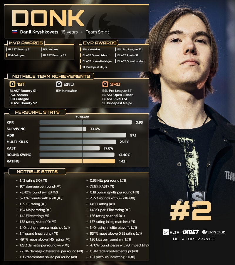 2024年登頂Top1的Team Spirit選手donk,在2025年的賽季依舊發揮出彩,他在包括全年評分等數據皆排名第一,也獲得包括IEM科隆站等賽事在內的冠軍及MVP,最終他被HLTV排在了年度的第2名。