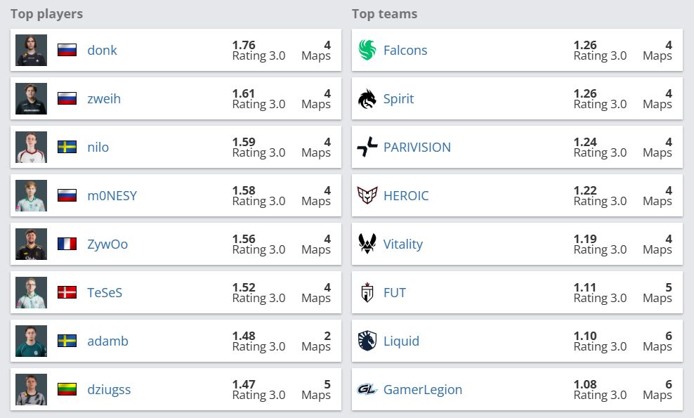 在前兩輪賽事中,表現最好的三名選手分別是donk (1.76)、zweih (1.61)和nilo (1.59),donk在與SINNERS和Inner Circles的比賽中繳出了1.88、1.53、1.49和2.21的豪華數據,幫助Team Spirit輕鬆晉級八強賽。