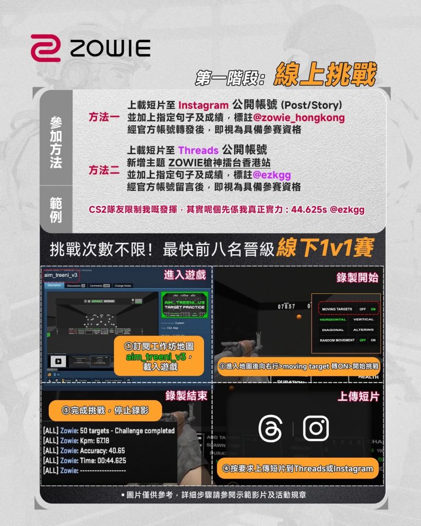 只要喺指定地圖以最快速度打中 50 個 targets,就有機會入圍全港頭 8 強,贏走 ZOWIE XL2566X+ 同其他豐富獎品!🔥🔥