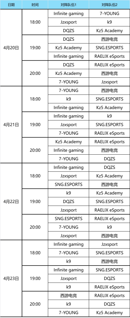 至於台灣隊伍RAELIX連續四日迎來兩連戰,首先在4月20日晚上迎戰Infinite gaming及DQZS,之後4月21日與7-YOUNG及Kz5 Academy交手,再會在4月22日與Jzxsport及SNG.ESPORTS較量,最後在4月23日面對k9及西遊電競完成小組賽之旅。