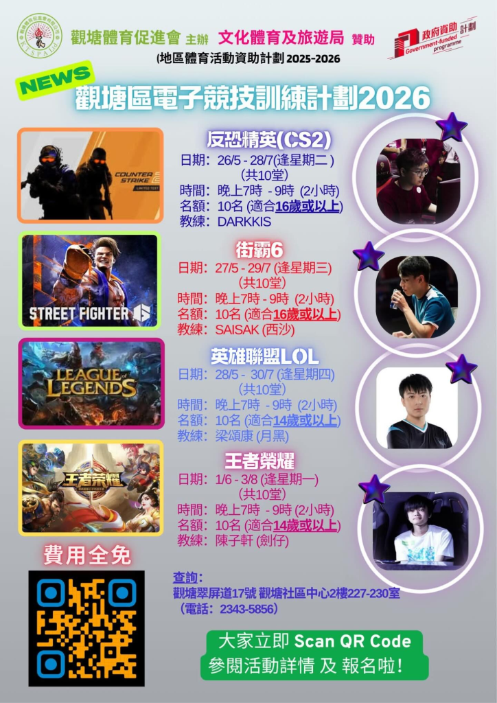 觀塘體育促進會最近公佈了觀塘區電子競技訓練計劃2026,今年繼續沿用去年四個項目CS2、LOL、街霸以及王者榮耀作為訓練項目,有興趣參加者可以透過內文QR Code及鏈結免費報名。